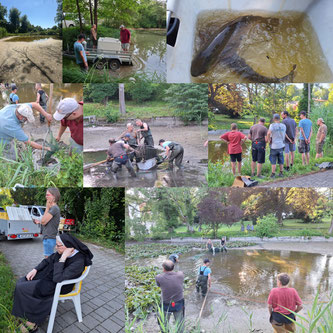 Wie aus dem vorherigen Zeitungsbericht zu entnehmen, wurden wir zu einer Rettungsaktion nach Tutzing gerufen. Hier war der Fischweiher am Benediktinerweg fast komplett ausgetrocknet. Auf bitte der Tierhilfe Tutzing wurden kurzfristig am 01.07.2025 9 Mitglieder unseres Vereins (Vorstände und helfende Mitglieder) aktiv. Hier wurden wir von ebenso 9 Mitgliedern der Tierhilfe Tutzing unterstützt. Und die Aktion war ein voller Erfolg. Wir konnten unter anderem 5 Grasfische, 2 Schleien und über 500 klein Fische retten und auf unsere Vereinsgewässer verteilen. Natürlich wurde das alles von einigen Interessierten Anwohnern verfolgt.